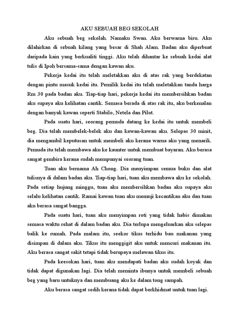 Setelah siap aku dihantar ke sebuah kedai alat tulis dengan lori yang besar. AKU SEBUAH BEGkarangan autobiografi AKU SEBUAH BEG. Aku sebuah beg sekolah.